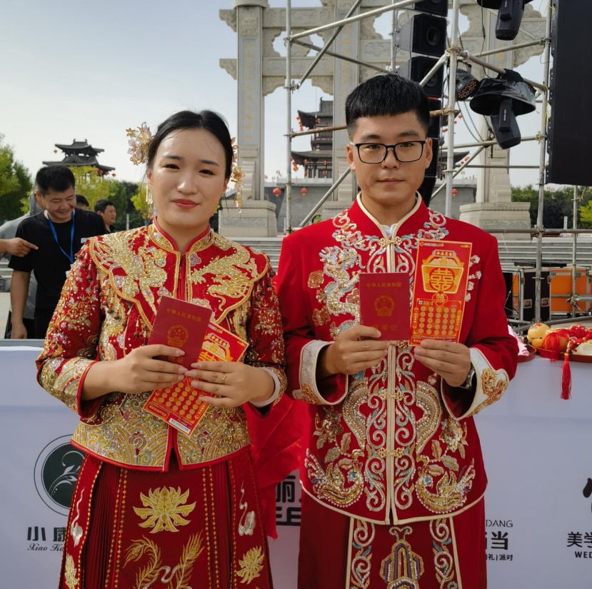 仪式上,魏县民政局局长郭福林为新人们证婚,魏县福彩中心向20对新人分别赠送了刮刮乐“囍”票,祝新人 “囍”结良缘、喜上加囍。