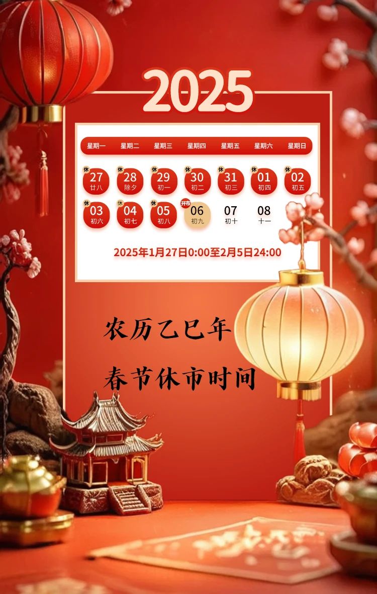 根据《财政部关于2025年彩票市场休市安排的公告》(中华人民共和国财政部公告2024年第19号)的要求,福利彩票2025年春节休市时间为2025年1月27日0:00至2月5日24:00。休市期间,除即开型福利彩票外,停止全国其他各类福利彩票游戏的销售、开奖和兑奖。