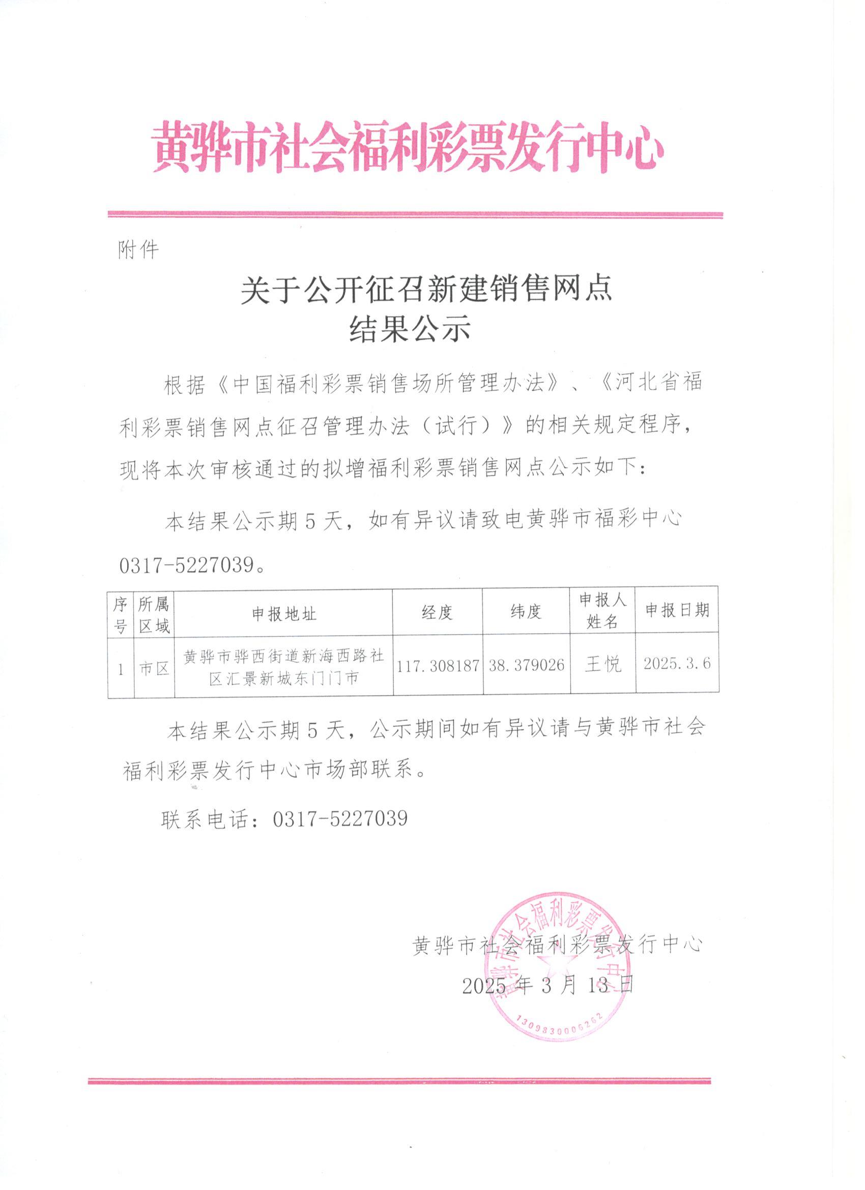 【公告】关于公开征召新建销售网点结果公示(黄骅)