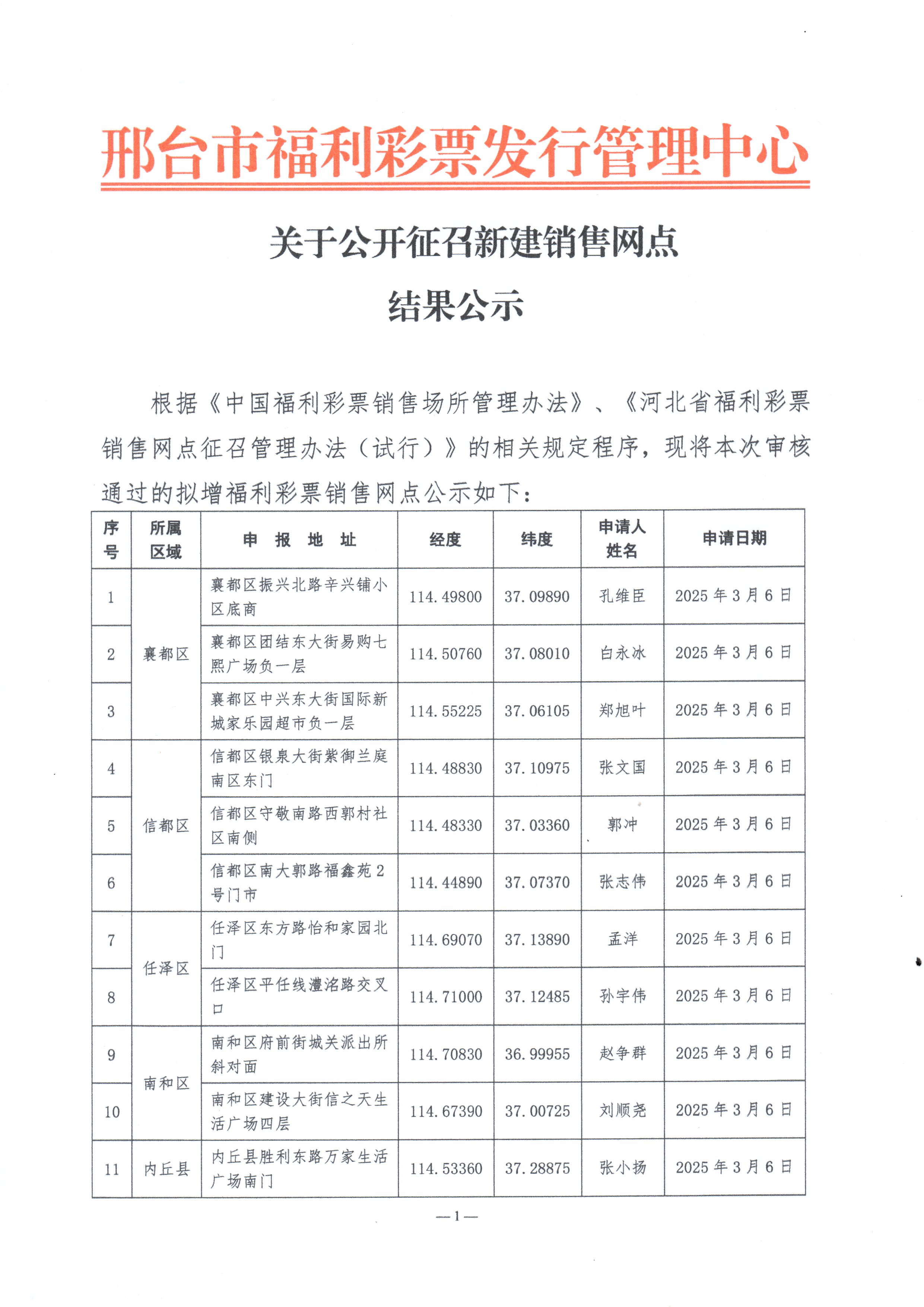 【公告】关于公开征召新建销售网点结果公示(邢台)