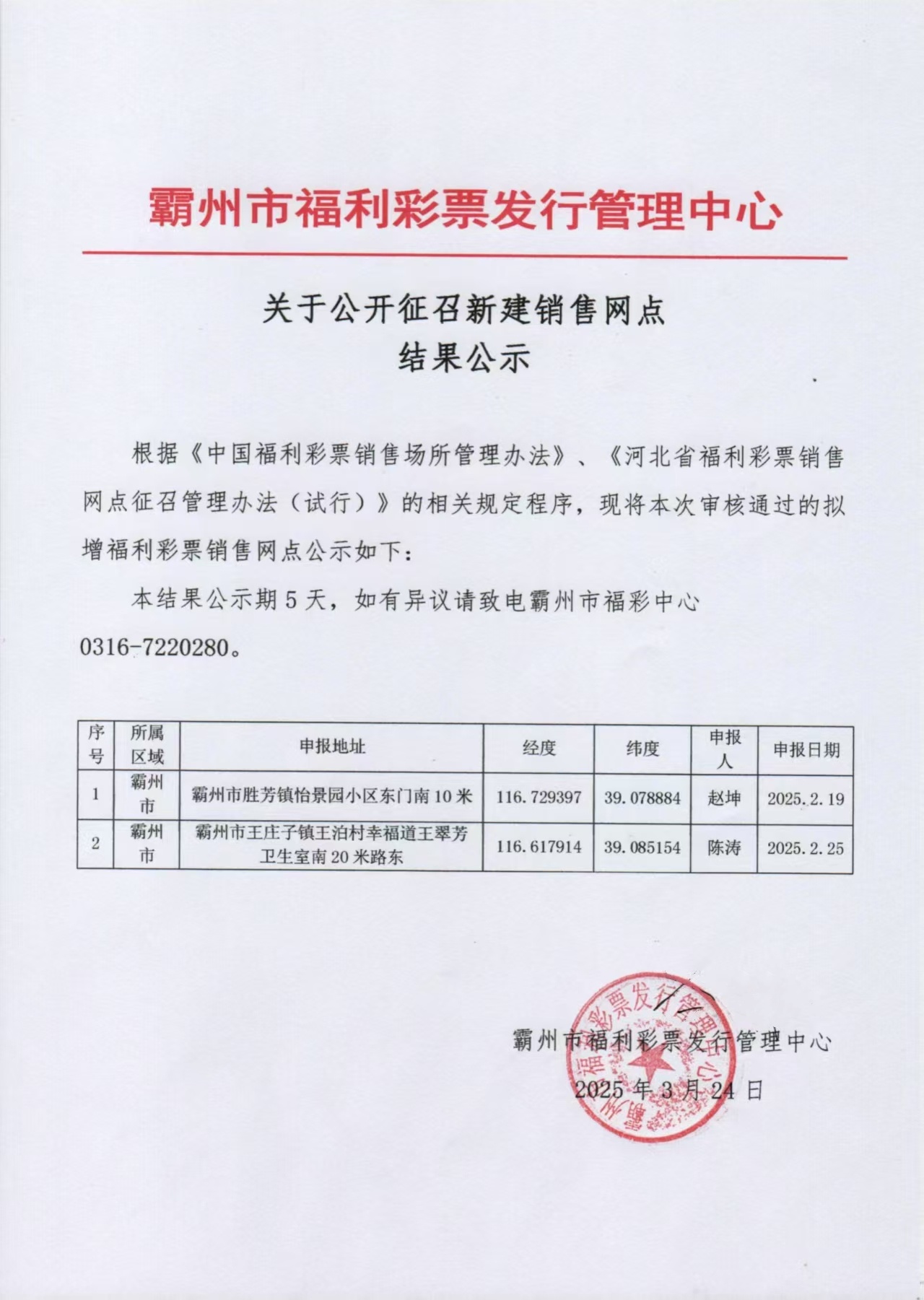 【公告】关于公开征召新建销售网点结果公示(霸州)