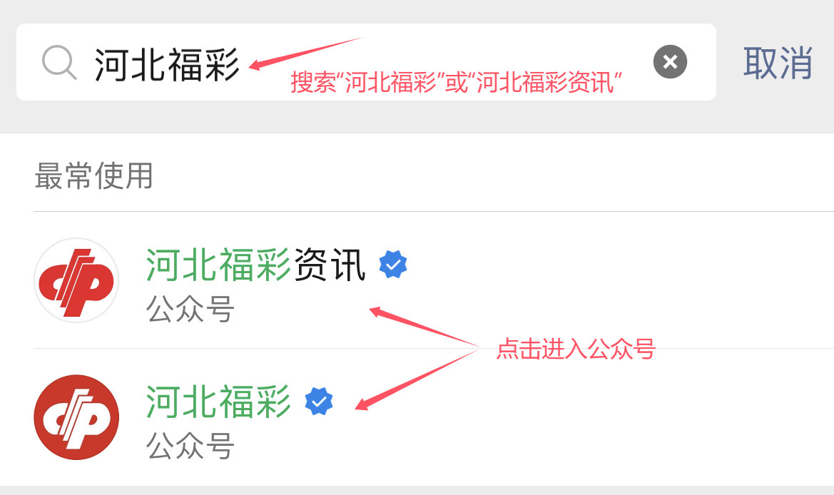 微信搜索“河北福彩”或“河北福彩资讯”公众号,并点击进入。