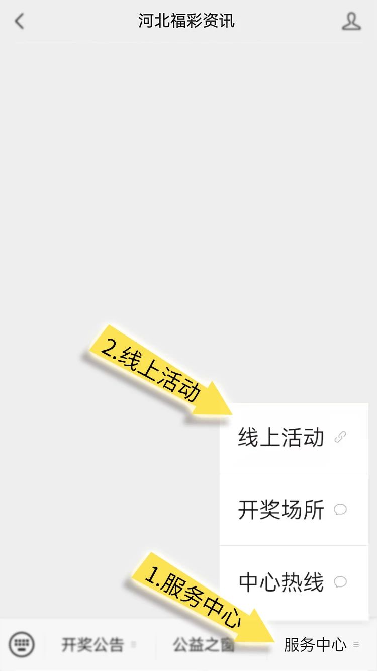 点击“河北福彩”或“河北福彩资讯”公众号下方菜单栏“服务中心”-“线上活动”,选择中奖的活动。