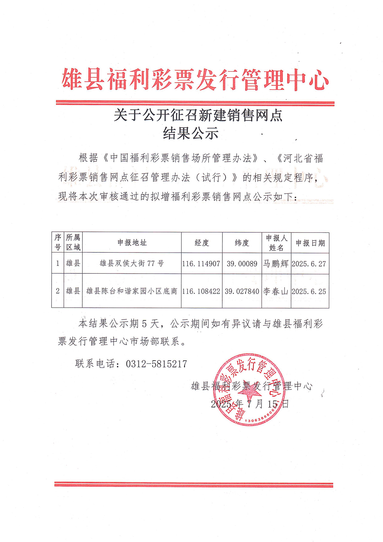 【公告】关于公开征召新建销售网点结果公示(雄县)