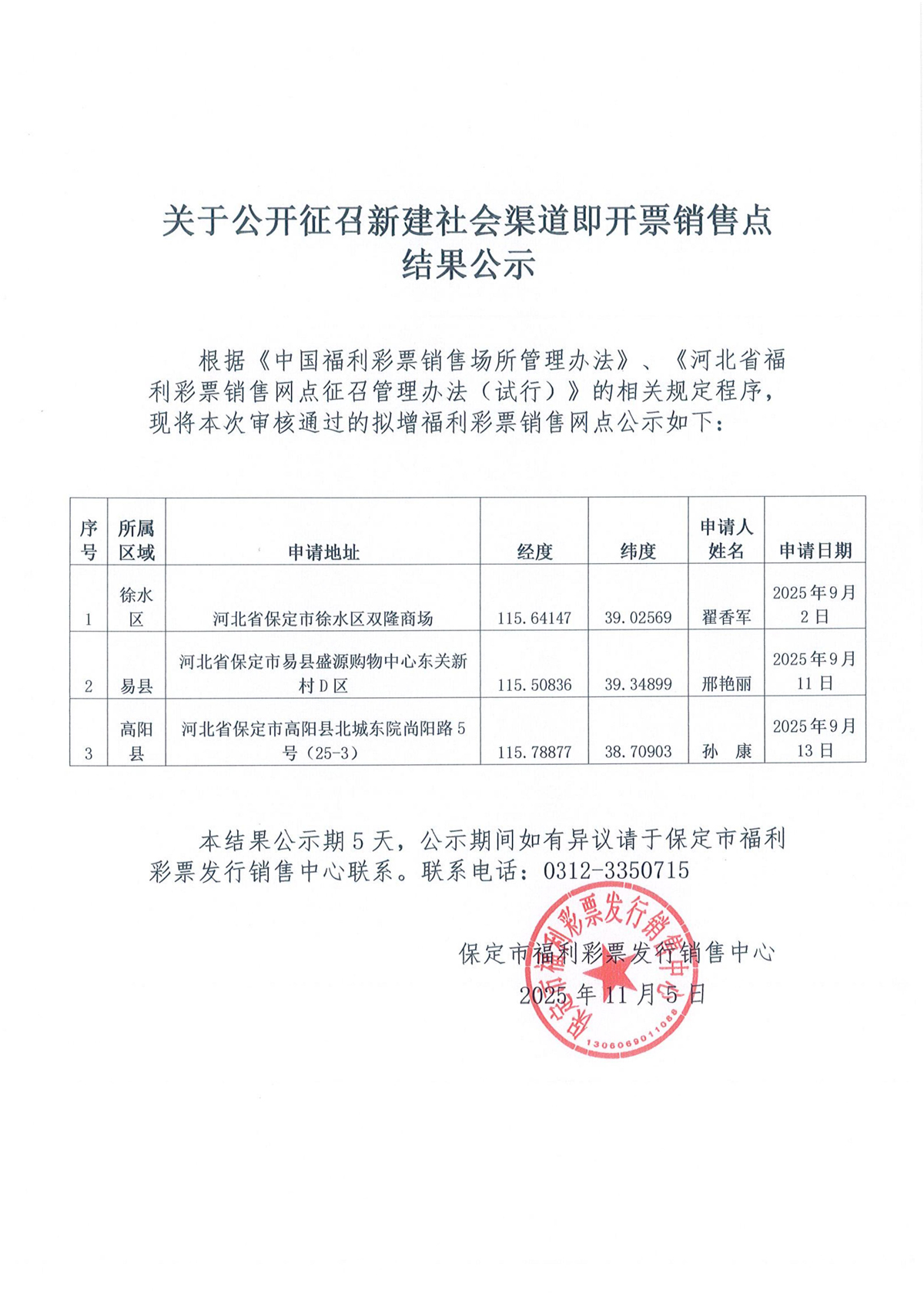 【公告】关于公开征召新建社会渠道即开票销售点结果公示(保定)