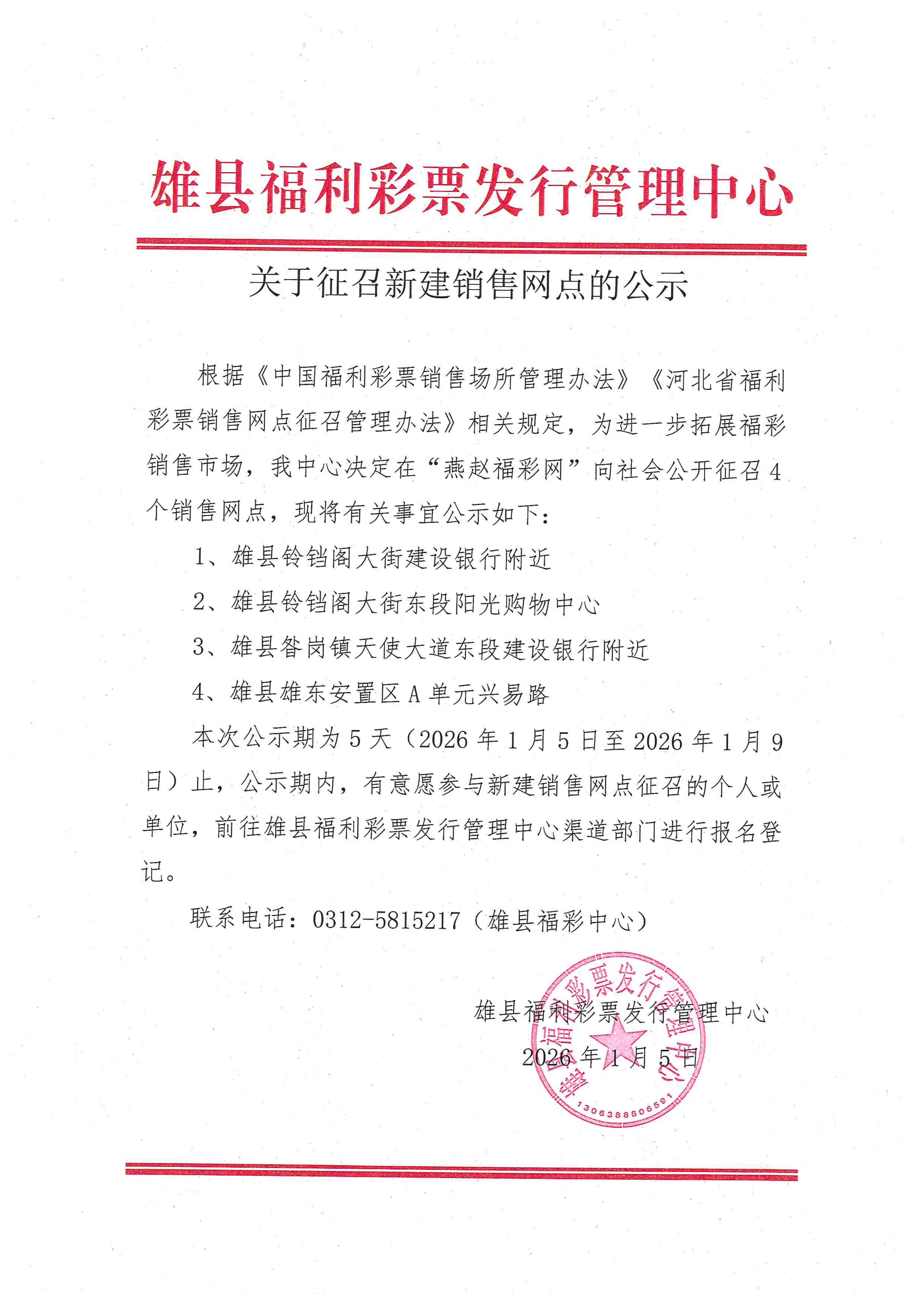 / 【公告】关于征召新建销售网点的公示(雄县)