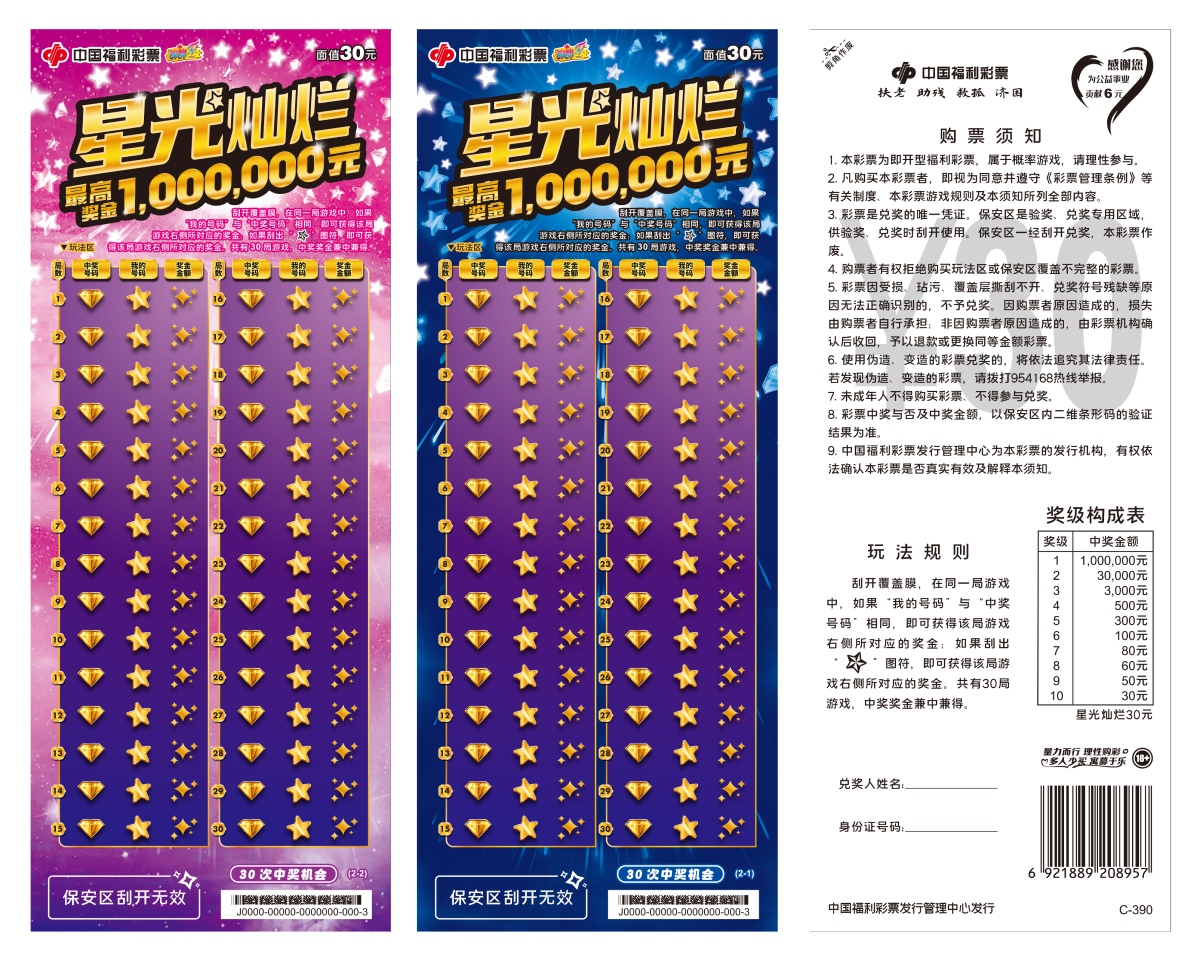 刮开覆盖膜,在同一局游戏中,如果“我的号码”与“中奖号码”相同,即可获得该局游戏右侧所对应的奖金;如果刮出“星星”图符,即可获得该局游戏右侧所对应的奖金。共有30局游戏,中奖奖金兼中兼得。