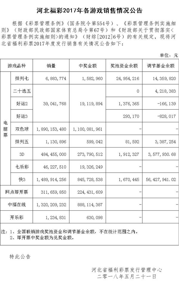 / 【公告】河北福彩2017年各游戏销售情况公告