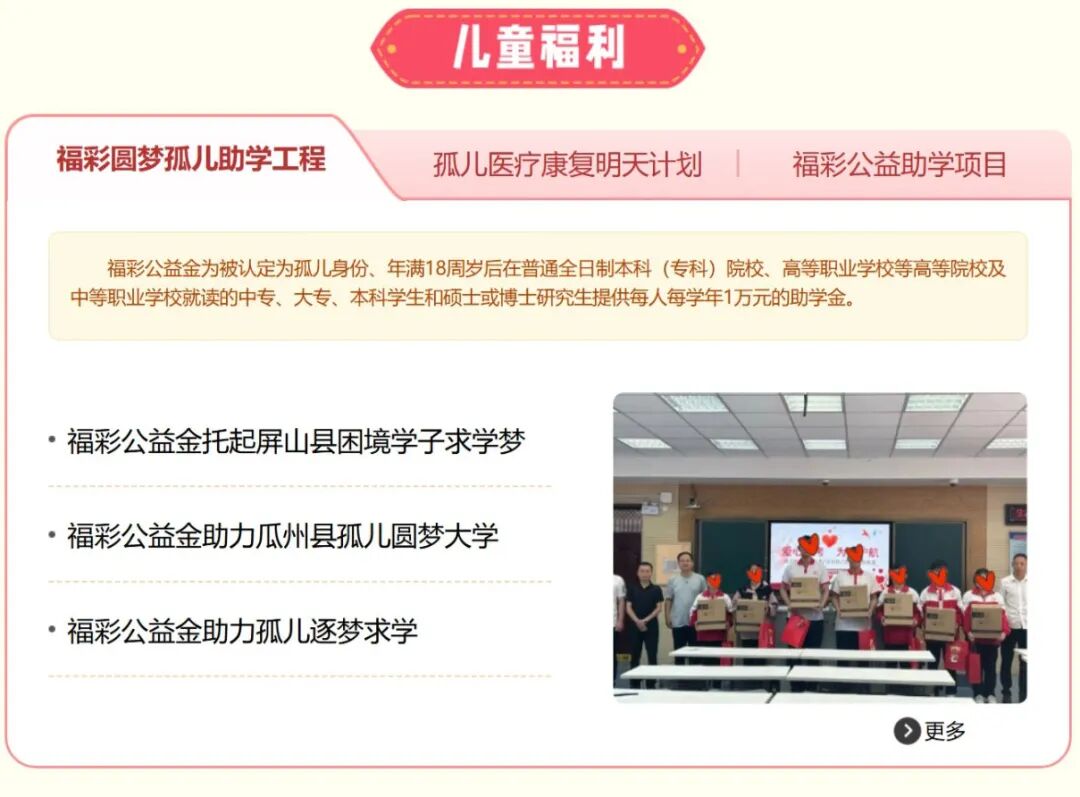 近年来,各省福彩中心开展了形式多样的公益活动,有关注偏远地区孩子体育设施建设的“爱心操场”项目,有送去丰富多彩素质课程的“乡村美育计划”,有为残疾儿童提供养育和康复服务的“添翼计划”……“扶老、助残、救孤、济困”的发行宗旨,在一个个公益活动中有了最好的体现。